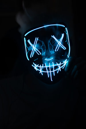 Man with long disheveled hair in a lighting neon glowing mask. Halloween dress-up party. Anonymous person is a cyber criminal. People in creepy costumes. All Saints Night.