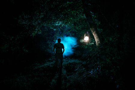 strange light in a dark forest at night. Silhouette of person standing in the dark forest with light. Horror halloween concept. strange silhouette in a dark spooky forest at night