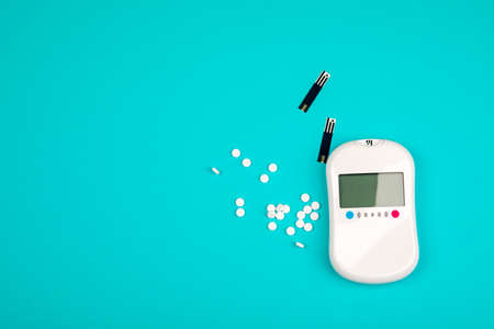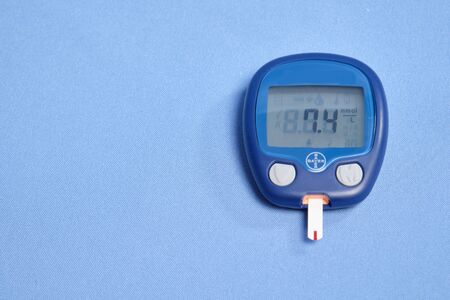 Glucometer on blue background. World Diabetes day