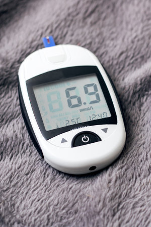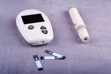 Detailed view of a glucometer with sensors and needle, emphasizing its importance in diabetes care and health management in everyday life