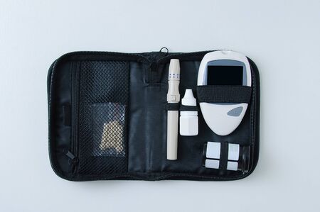 The diabetic measures the level of glucose in the blood. Diabetes concept. Diabetic supplies on a white background