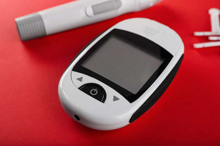 Digital glucometer, lancets and pen on red background. Diabetes control