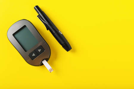 Diabetes concept. Blood glucose meter. Digital glucometer and lancet pen on yellow background, close-up. Flat lay.