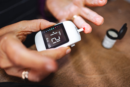 Diabetic patient doing glucose level blood test using ultra mini glucometer and small drop of blood from finger and test strips.