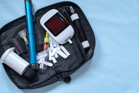 Diabetes. Diabetes concept. Glucose meter and injections for insulin on a blue background. Diabetic supplies