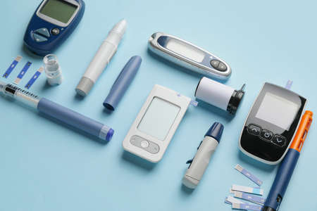 Digital glucometer, lancet pen, disposable needles and test strips on pastel blue background. Top view. Diabetes concept