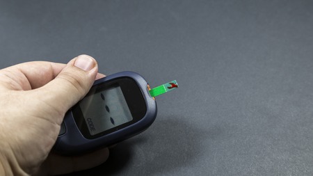 Man with diabetes holding a portable digital glucose meter in his hand as he measures his own blood sugar levels after drawing a drop of blood from his finger