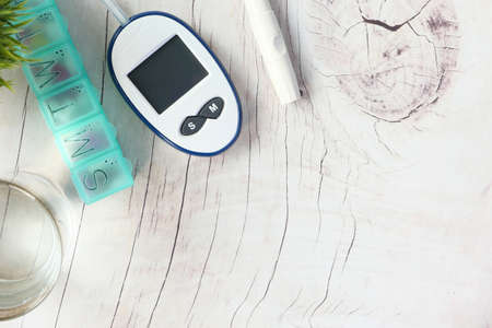 blood glucose meter, pill box and water glass on table