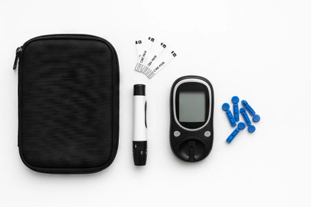 Black glucose meter with strips and lancets for diabetes management, highlighting blood sugar control and health monitoring on clean white background.