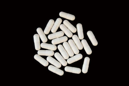 White medical capsules of glucosamine chondroitin, healthy supplement pills on a dark background, macro image.