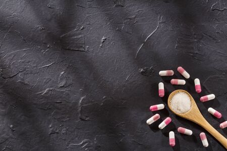 Collagen powder and pills on a pink background. Extra protein intake. Natural cosmetic supplement for skin, bones, joints and intestines. A plant or fish based. Side view. Copy space