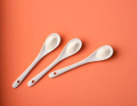Organic gelatin powder also called hydrolyzed collagen - Three ceramic spoons