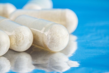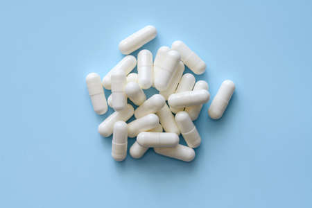 White pill capsules on blue background. Simple flat lay with pastel texture. Medical concept. Stock photography.
