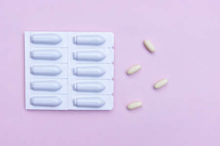 Gynecological medicines for women's health in form of suppository, capsules on pink background. Vulvovaginal infections treatment. Top view.