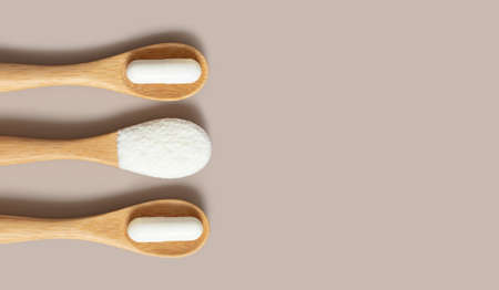 Collagen powder and pills in wooden spoons on a beige background. natural beauty supplement. Copy space, top view, flat lay.