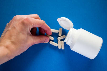 White pills, capsules scattered from a white bottle, jar on a blue background. Health care and treatment concept