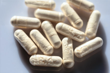 Capsule pills on white background, supplement and medicine concept. Closeup, copy space