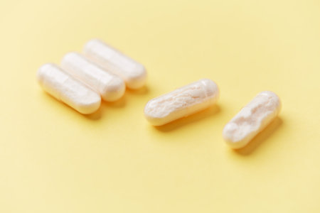 White pills on yellow background. Simple flat lay with pastel texture and copy space. Medical concept. Stock photography.