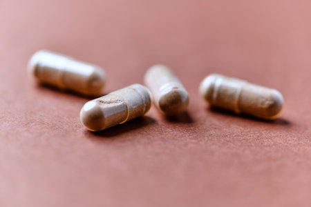 Two transparent capsules containing medicine granules are spilling their content on a dark surface, with some small pills nearby
