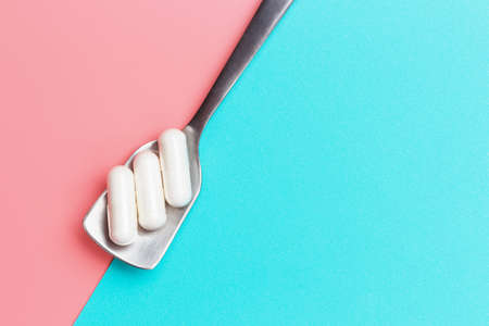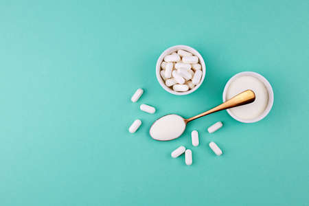 When taking antibiotics you should also take probiotics to restore good bacteria in gut. Balance between antibiotics and probiotics concept. Antibiotic on spoon on blue and probiotic pills on green.