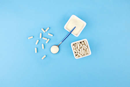 Collagen powder for the preparation of a medicinal mixture, a jar for pills, and a glass of water on a blue background. top view, horizontal