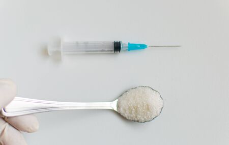A spoonful of sugar and a syringe. The concept of harm to sugar and the onset of diabetes.