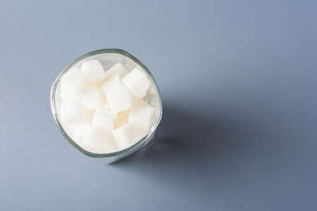 Top view glass full of white sugar cube sweet food ingredient, studio shot isolated on gray background, health high blood risk of diabetes and calorie intake concept and unhealthy drink