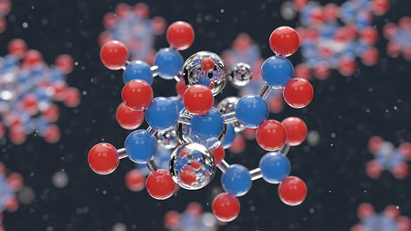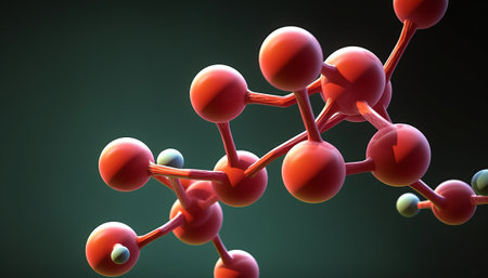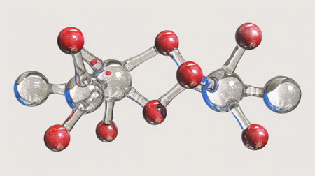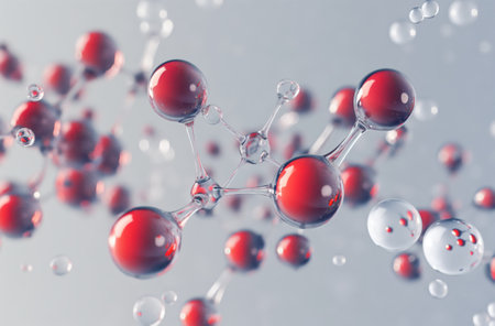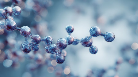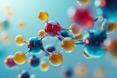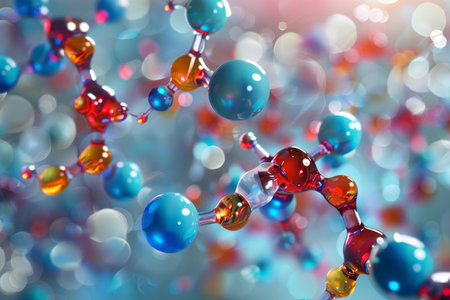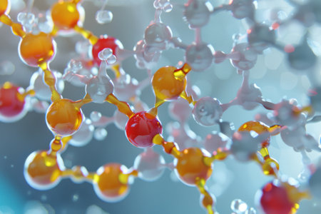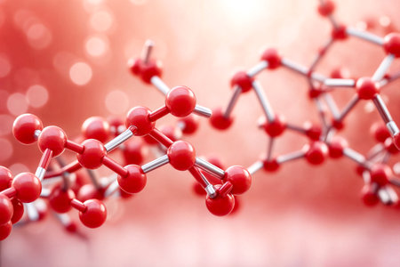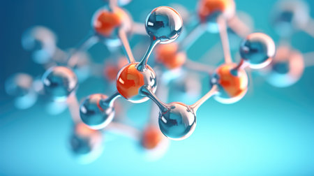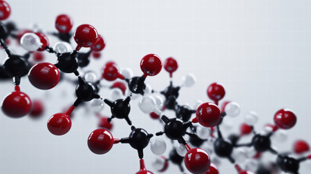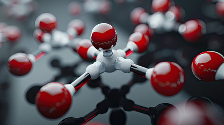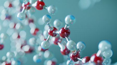 molecular structure, detailed close up of red and white chemical molecules, soft focus background, blue gradient colors enhance depth perception and scientific theme, ideal for educational use