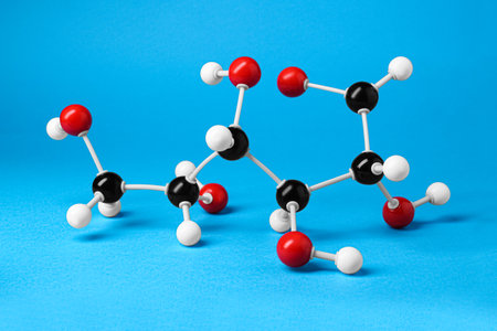 Molecule of glucose on light blue background. chemical model