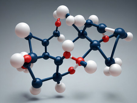3D illustration of a molecular structure model featuring red and white atoms connected by bonds against a soft blue background.