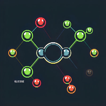 Isolated glucose molecule made by molecular model on white sugar. C6H12O6 sugar chemical formula with colored atoms and bonds