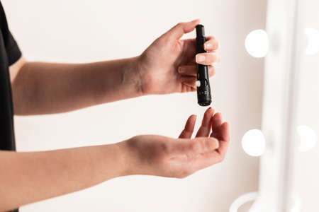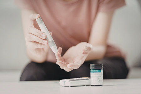 Woman using lancet for diabetes. Hypoglycemia, blood sugar level control at home