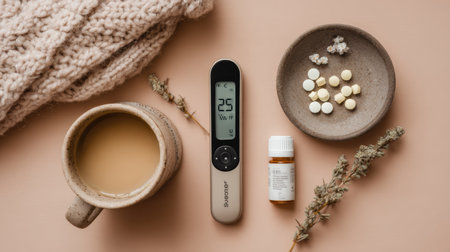 A flat cozy lay displays a digital thermometer, cough drops, vapor rub, and a warm beverage, suggesting a restful approach to cold and flu care during winter.