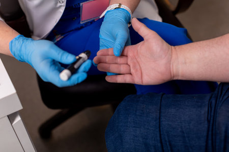Close up medical worker checking glycemia test for diabetes to female patient during virus outbreak