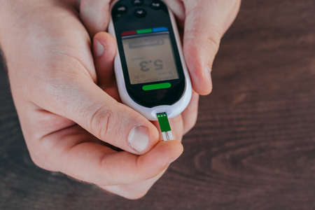 Diabetes concept. Glucometer in the hands of a man, sugar control.