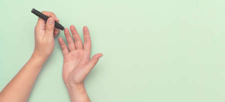 Man using lancet for diabetes, checking blood sugar level. Wide image with copy space, green background. Diabetes concept