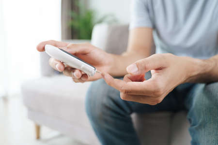 Man checking blood sugar level by Digital Glucose meter, Healthcare and Medical, diabetes, glycemia concept