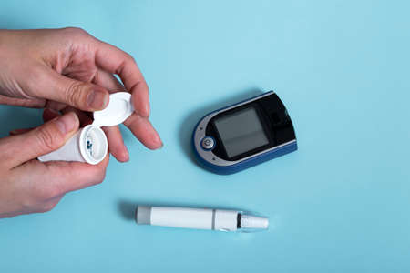 woman getting ready measures blood sugar using a glucometer. diabetes concept on blue background close up top view