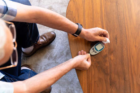 Overhead view of caucasian senior man measuring his blood sugar using glucometer at home. Medical care and retirement senior lifestyle concept