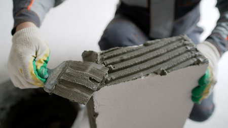 closeup worker applying concrete glue to brick cuts tile