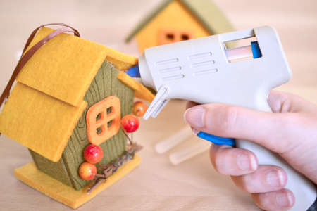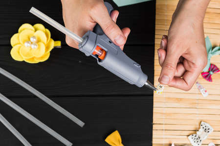 Woman glues glue gun. Woman doing craft jewelry. Women's handicrafts. The concept of creativity.