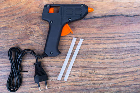 Hot-melt gun, construction tools. Glue gun and rods on wooden background.