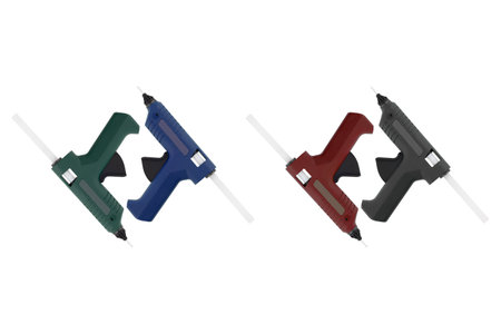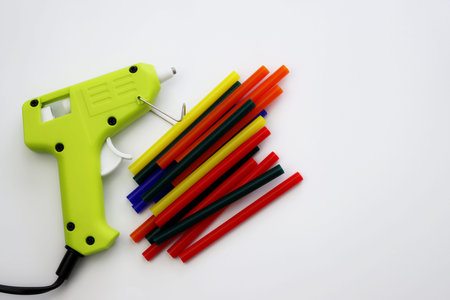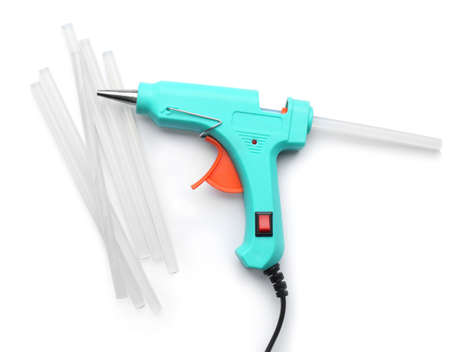 Hot-melt gun, construction tools. Glue gun and rods on white background