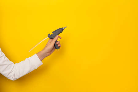 Female hand is holding hot pistol glue gun in torn hole of yellow background. Stationery tool necessary to create creative craft. Repair work appliance silicone. Minimalism concept. Copy space.