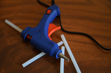 Electric hot glue gun on a wood background. the concept of repair or creativity background