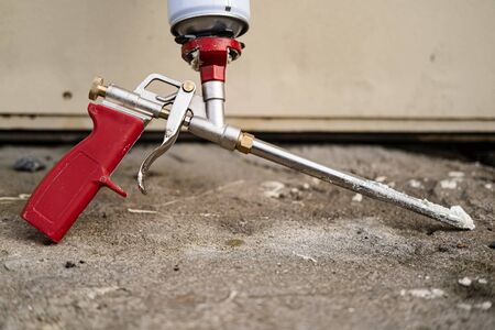 Construction foam gun with a defective cylinder. Foam bottle defect