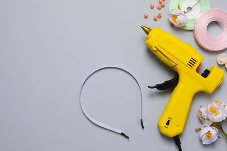 Hot glue gun, plastic headband and handicraft materials on gray background, flat lay. Space for text