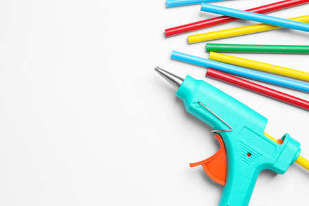 Turquoise glue gun and sticks on white background, flat lay. Space for text