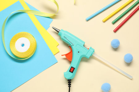 Hot glue gun and handicraft materials on light blue background, flat lay
