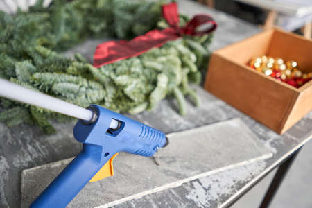 Several glue guns in the foreground on the Board. Manufacturer of Christmas wreath from branches of pine for holiday. Master class on making decorative ornaments.